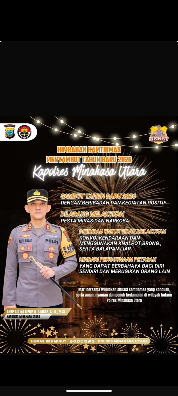 PILARBERITA.ID, SULUT – Dalam rangka menyambut Tahun Baru 2026, Kapolres Kabupaten Minahasa Utara (Minut) Auliya Rifqie Djabar, memberikan sejumlah imbauan kepada seluruh masyarakat pada malam pergantian Tahun nanti.