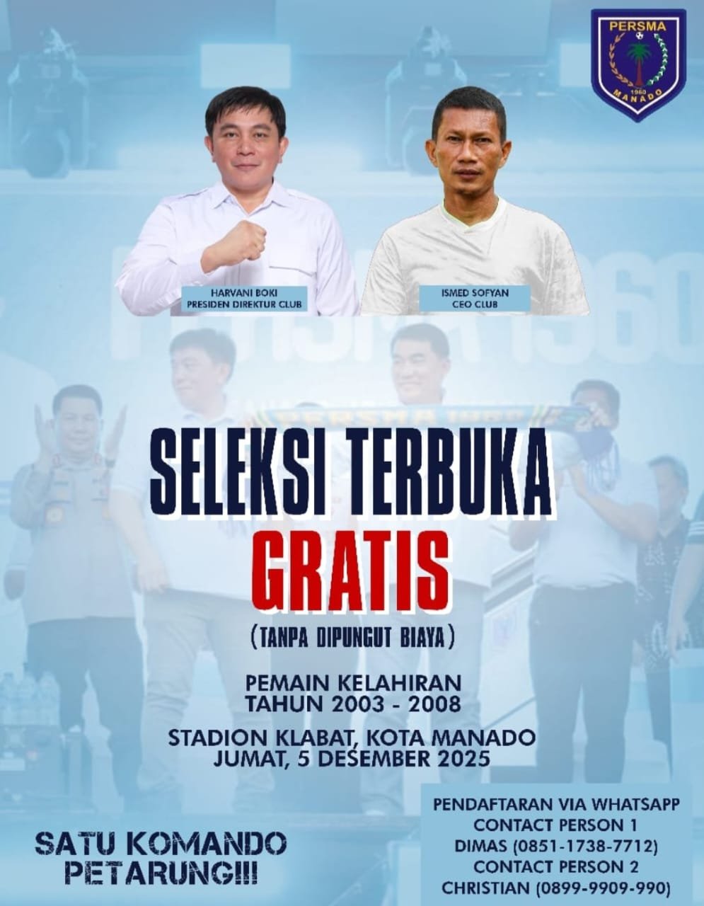 PILARBERITA.ID, SULUT – Klub Sepakbola Persma 1960 mengumumkan pelaksanaan seleksi terbuka bagi talenta muda Sulawesi Utara (Sulut) pada Jumat, 5/11/25, di Stadion Klabat Manado.