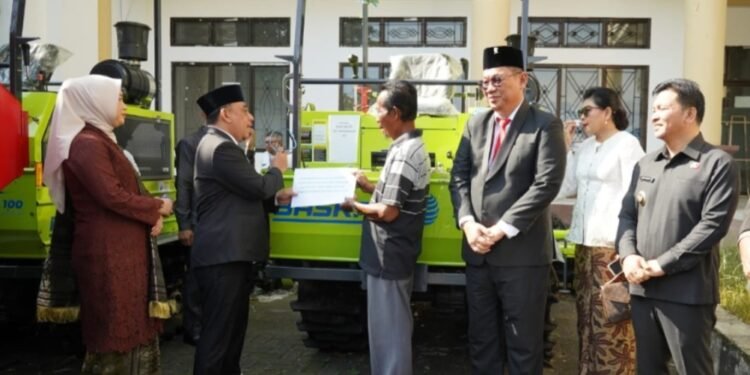 Penyerahan bantuan untuk kelompok tani berupa satu unit traktor dan beberapa unit combine harvester dilakukan dihalaman kantor Bupati Bolmong yang diterima oleh ketua masing-masing kelompok tani.